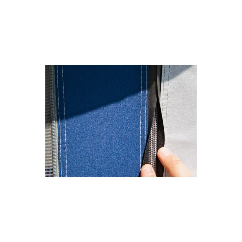 La paroi frontale est composée de 3 segments et ils peuvent donc tous être enlevés et remplacés les uns avec les autres : idéal pour un aménagement sur-mesure suivant vos besoins et votre emplacement en camping. Les fenêtres sont pourvues de volets et de fermeture éclair résistantes.
