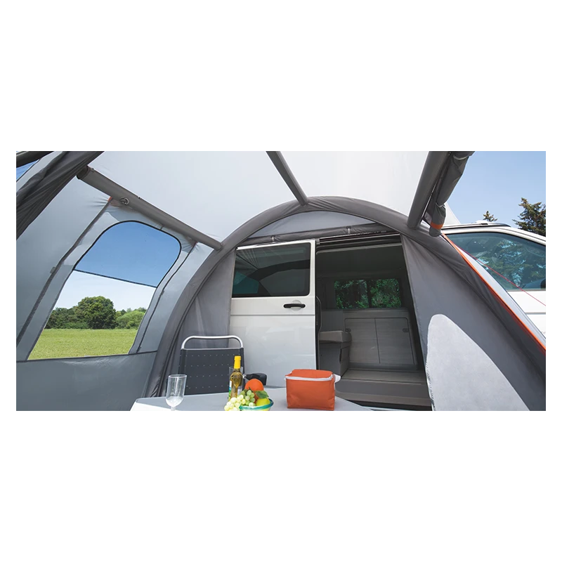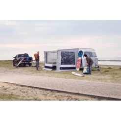 Très lumineux, le Picco Air de chez DWT possède de larges ouvertures pour profiter au maximum de l’extérieur. Ses ouvertures sont composées de moustiquaires et de volets enroulables. Côté véhicule, le Picco possède un sas de liaison avec ourlet pour recevoir la barre de sas mais aussi l’adaptateur de votre choix pour la fixation à votre fourgon.