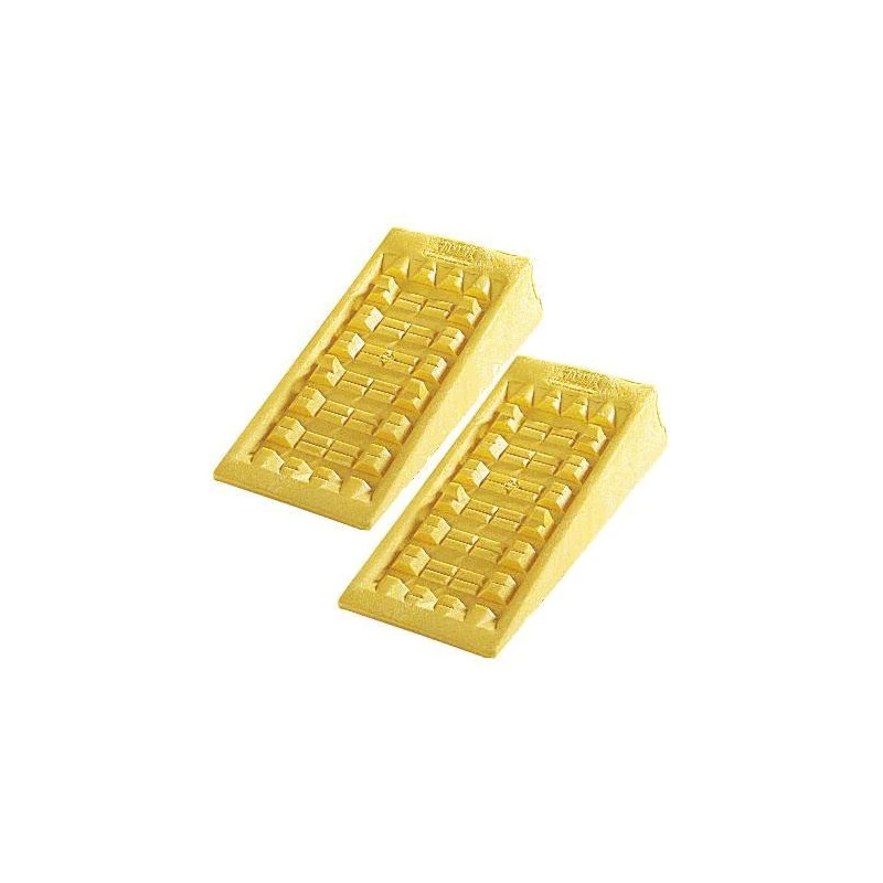 En plastique jaune au design novateur et ergonomique, cette paire de cales de roue pour la mise à niveau est très pratique : légères et peu encombrantes elles peuvent s’emboiter (se superposer) pour plus de hauteur. Autobloquante, la mise en place est très simple et permet de mettre le camping-car à niveau très précisément.