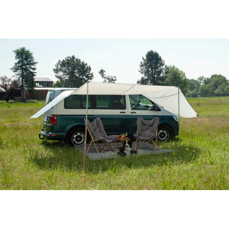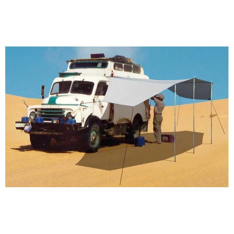 L’installation se fait le long d’un rail (longueur 300 cm) puis à l’aide d’haubans (cordage) et de piquets fournis. Le Mauritius XL offre un grand ombrage le long du véhicule, les côtés peuvent être orientés vers le bas afin de s’abriter du vent et du soleil. Les piquets livrés sont réglables en hauteur et s’adapte donc à la morphologie du véhicule.